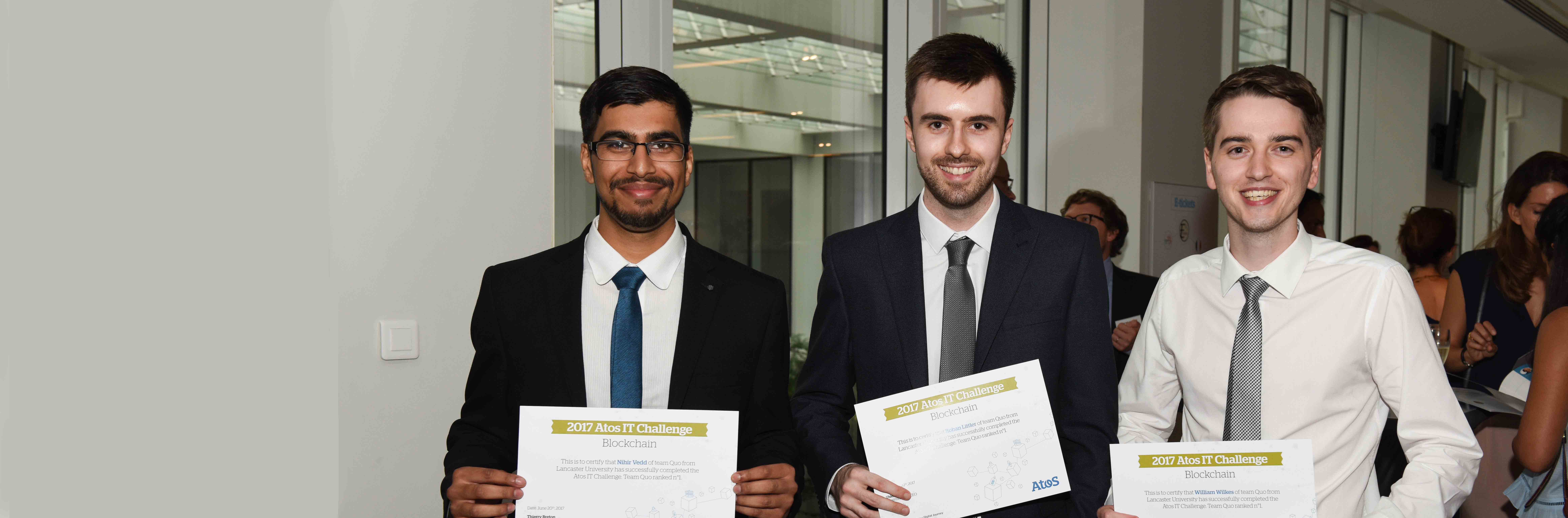 Nihir Vedd, Rohan Littler and Will Wilkes won first place at the Atos IT Challenge 2017 – beating off 76 other student teams from around the world to claim the €10,000 prize and a fast-tracked internship at Atos, a global technology company.